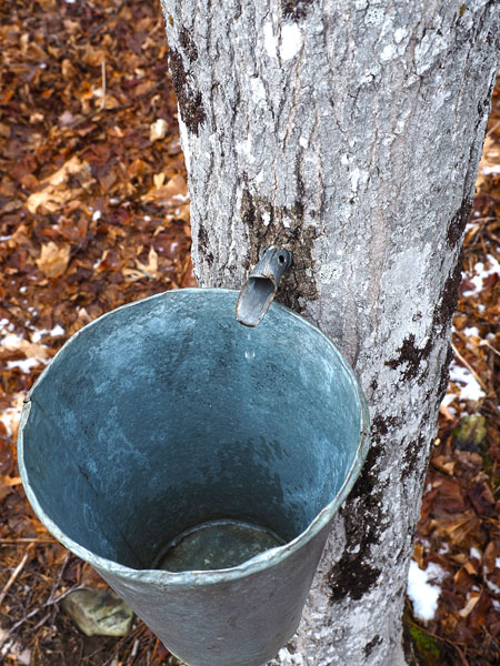 It’s spring and I’ve decided to try my hand at making maple syrup. I borrowed unused buckets and spiles (taps) from my neighbour. After the buckets and spiles were cleaned, I drilled five maples, inserted the spiles and hung the buckets.
