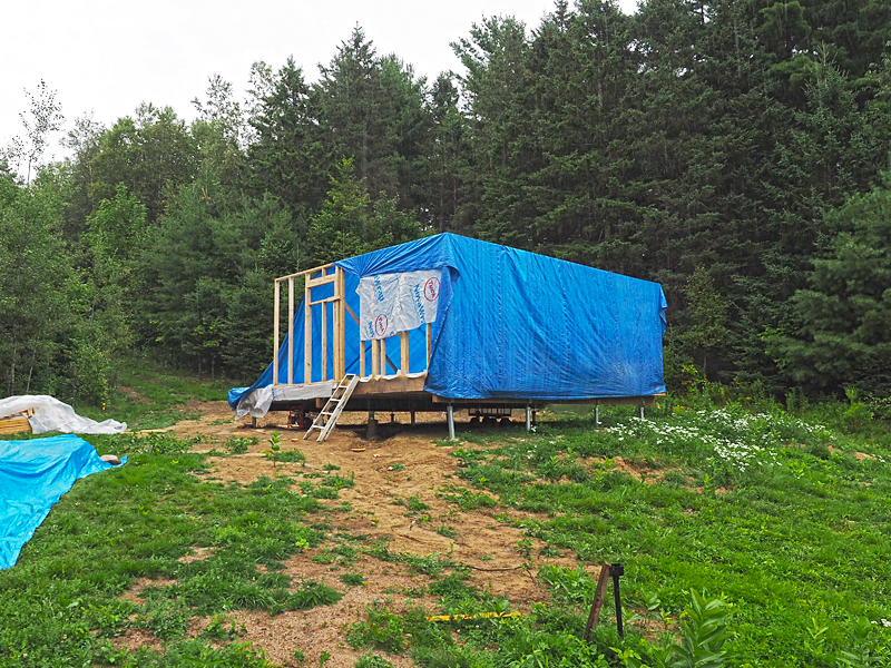 A retired contractor had recommended that I cover the floor with house wrap, so when it rains, it will prevent the plywood from delaminating and keep the insulation dry. It also means less time spent covering things up at the end of each day. It will be removed once the walls and roof are closed in. The rigid insulation and expanding foam lining under the cellulose fibre already provides a vapour barrier.