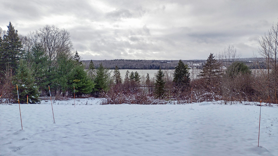A couple hurdles out of the way in the past two days. The NB Power service tech dropped by yesterday to stake out the service poles for the site. He pointed out two additional trees that should be removed, so I cut them down. I finally found an available electrician who will be submitting the forms for the service permit.