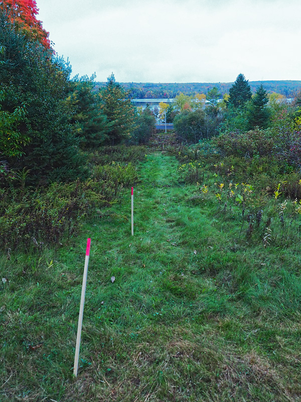 A couple hurdles out of the way in the past two days. The NB Power service tech dropped by yesterday to stake out the service poles for the site. He pointed out two additional trees that should be removed, so I cut them down. I finally found an available electrician who will be submitting the forms for the service permit.